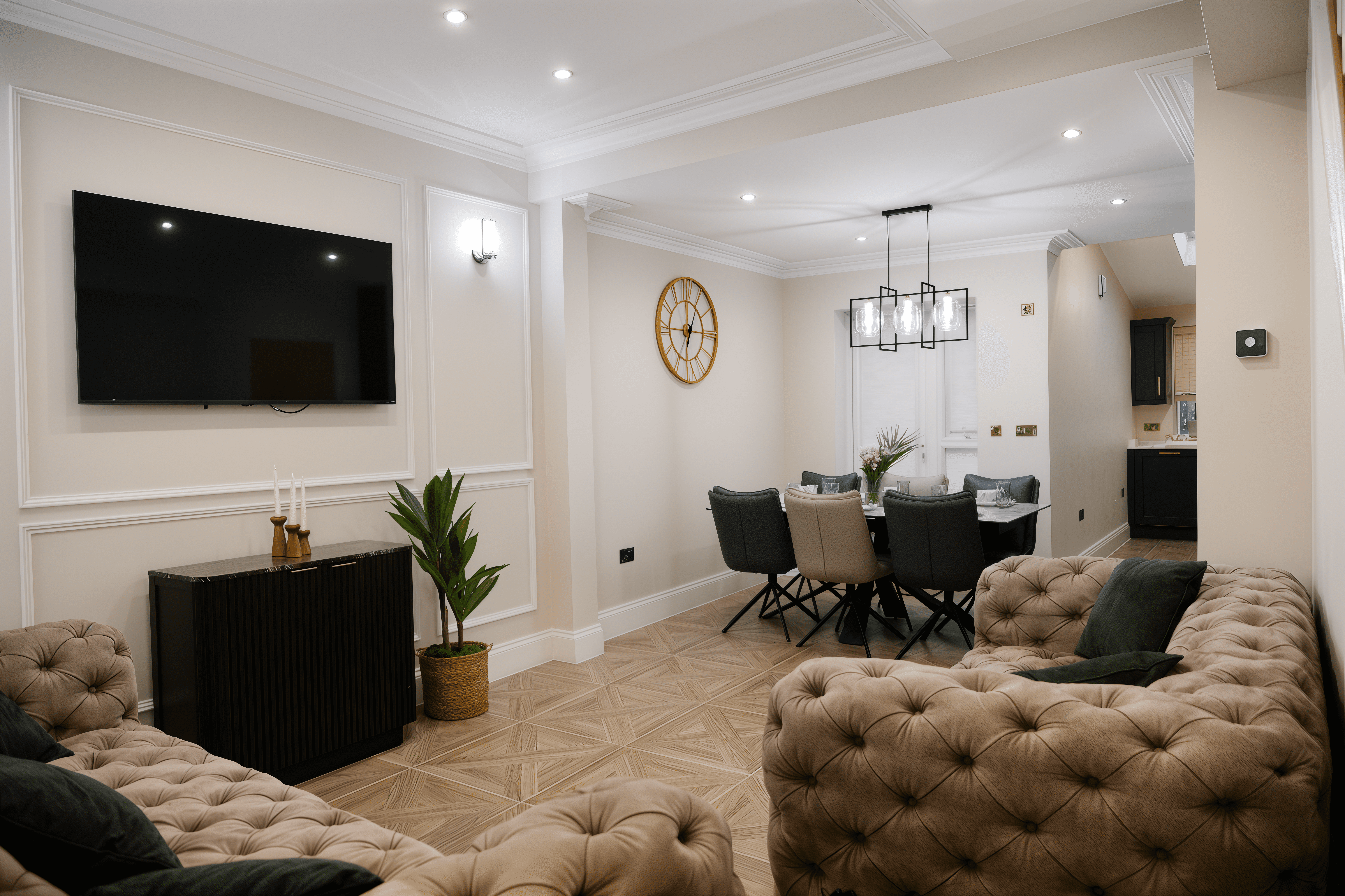 The scope of work included architectural design, structural planning, interior layout, and full project management. The property benefited from a rear extension, open-plan kitchen and living area, bespoke storage solutions, and high-quality material finishes.